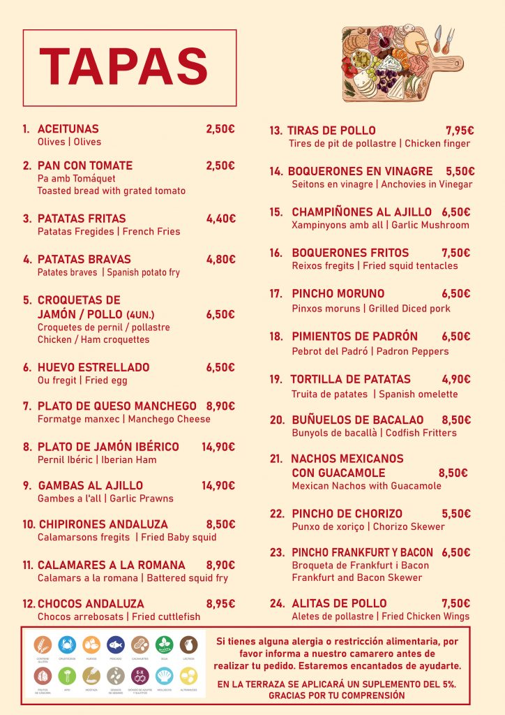 Nuestra oferta gastronómica es un viaje por los sabores más representativos de la cultura española, con un variado menú de tapas, pizzas artesanales y refrescantes cócteles. Cada visita promete ser una experiencia culinaria única.
